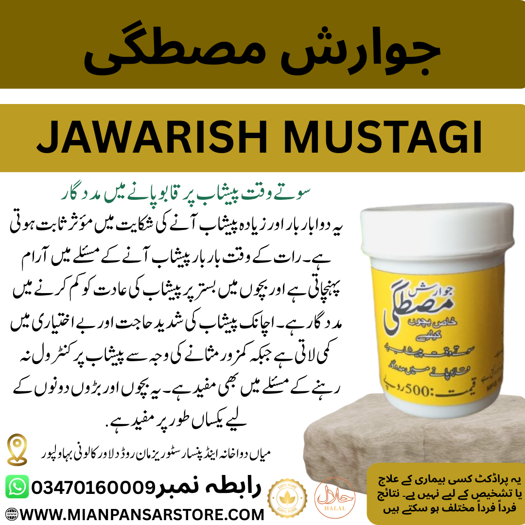 جوارشِ مصطگی ایک آزمودہ یونانی دوا ہے جو مثانے کو مضبوط بنانے اور پیشاب سے متعلق مسائل میں قدرتی طور پر مدد فراہم کرتی ہے۔ یہ دوا بار بار اور زیادہ پیشاب آنے، رات کے وقت پیشاب کی کثرت، اور اچانک پیشاب کی شدید حاجت جیسے مسائل میں مؤثر ثابت ہوتی ہے۔ بچوں میں بستر پر پیشاب کی عادت کو کم کرنے میں معاون ہے جبکہ بڑوں میں پیشاب کی بے اختیاری اور کمزور مثانے کی وجہ سے کنٹرول نہ رہنے کے مسئلے میں بھی فائدہ دیتی ہے۔